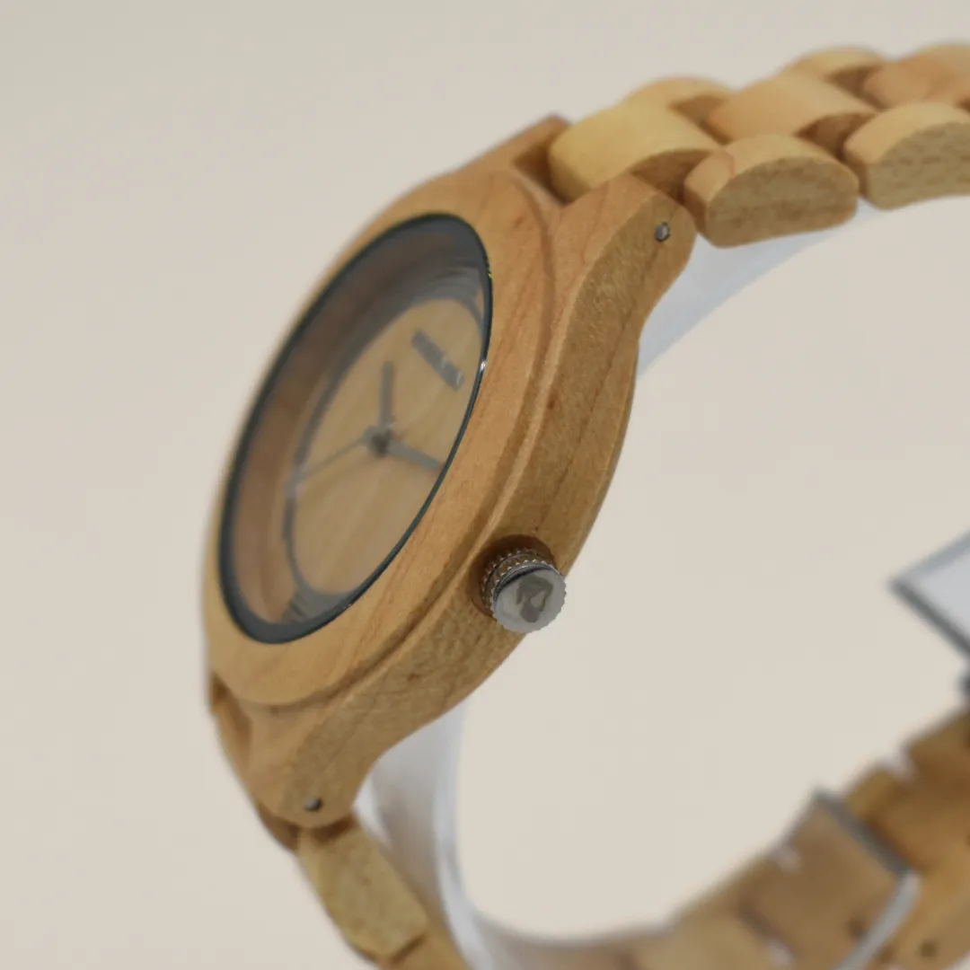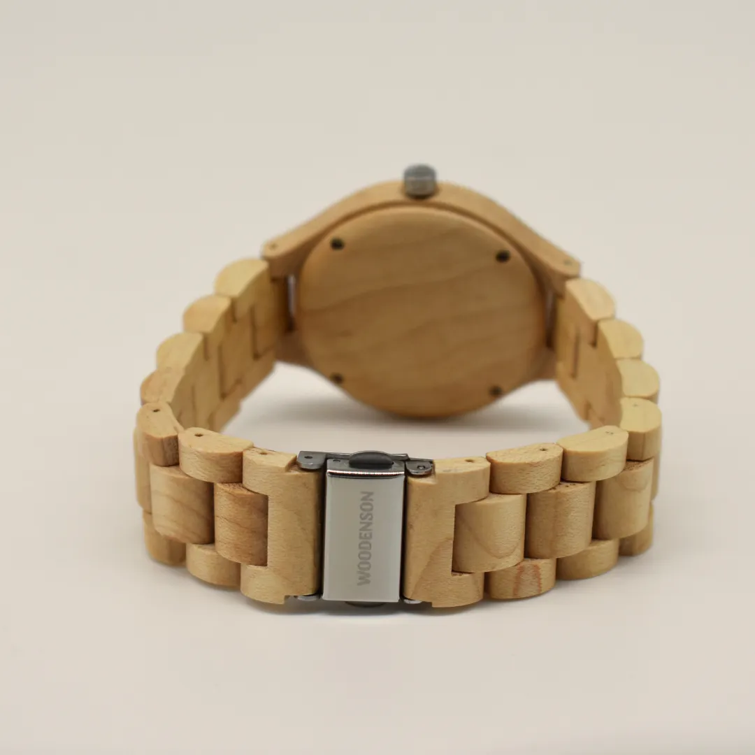 Correa: Madera natural con eslabones macizos. Cierre metálico oculto.