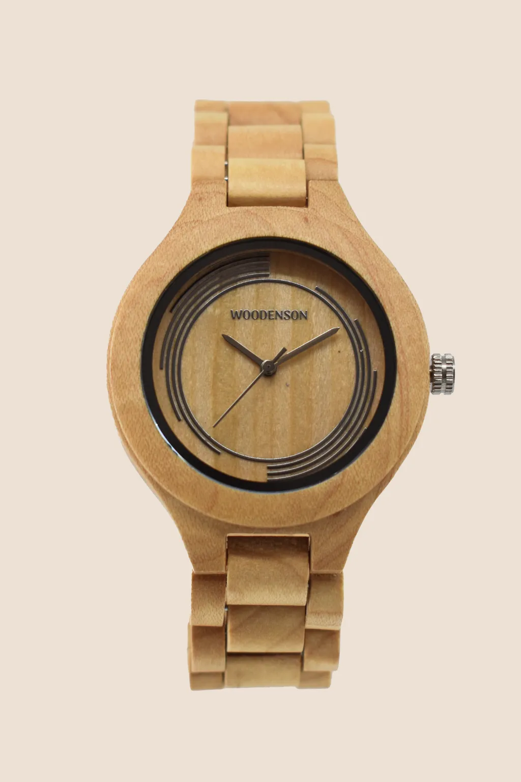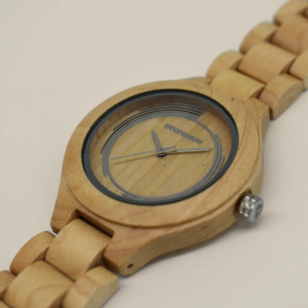 Color de la esfera: Madera clara con anillos metálicos concéntricos como única marcación visual. Estética minimalista y elegante.
