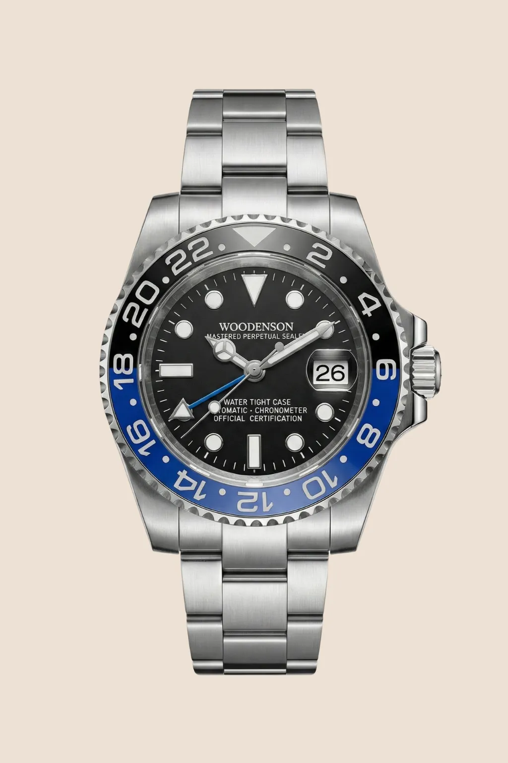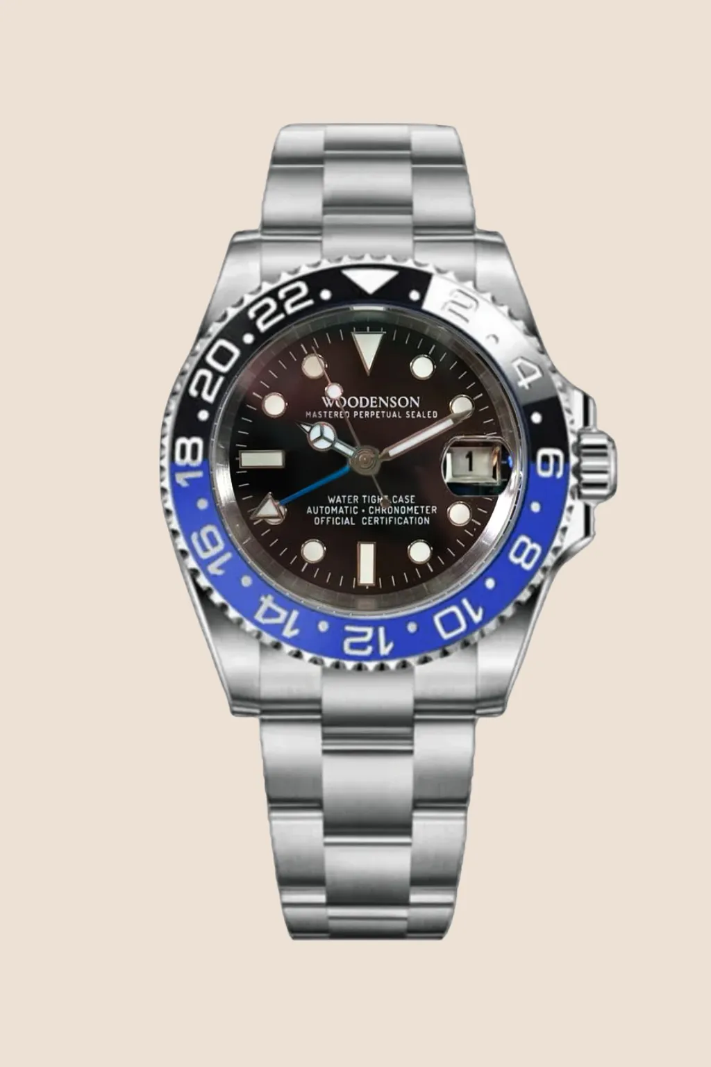 Funciones: Hora, fecha, GMT (3 agujas + manecilla adicional GMT)