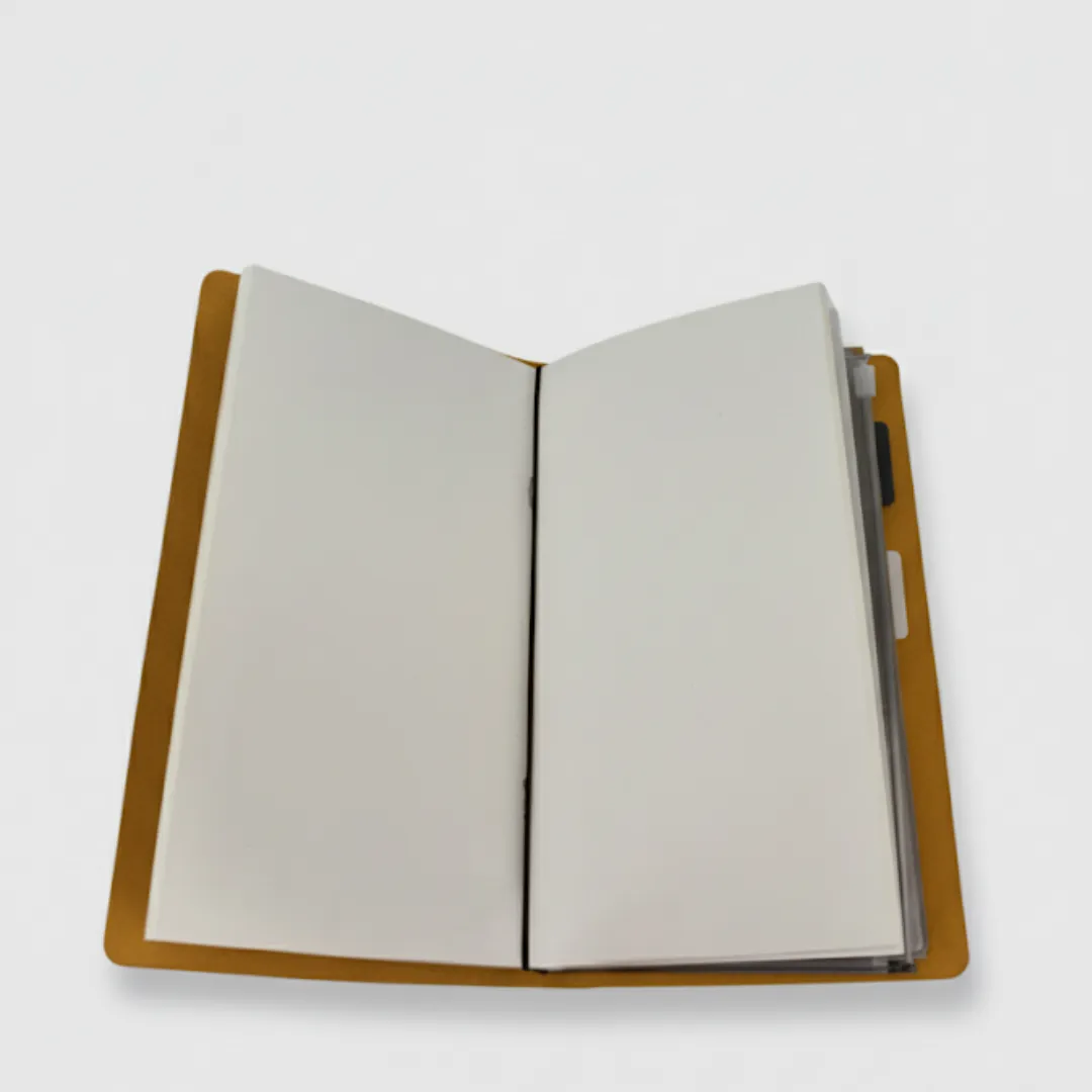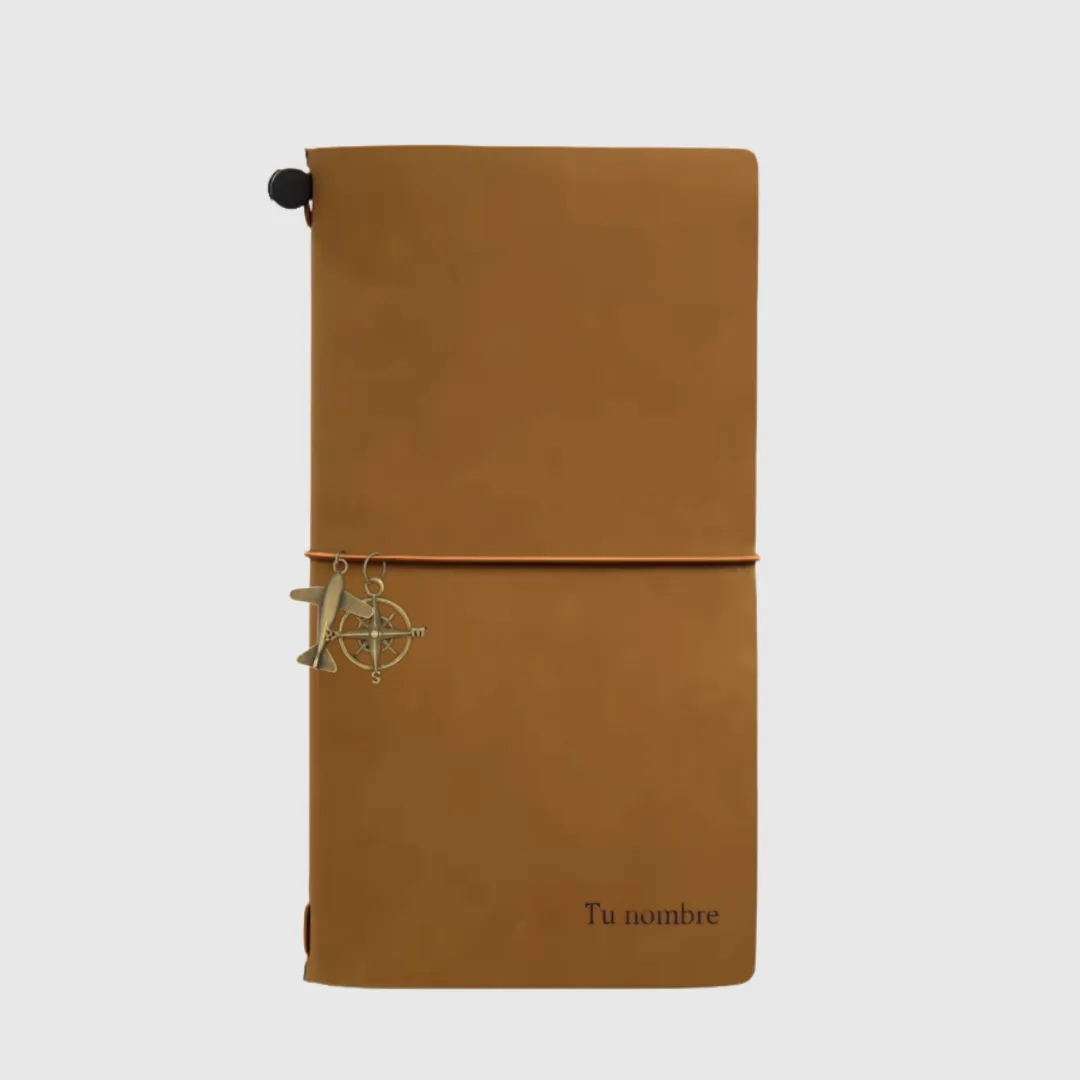 Traveller Notebook modular y recargable, diseñado para uso prolongado: tapas de cuero genuino que patinan con el tiempo, recambios intercambiables que se adaptan a distintas necesidades, funda de PVC con cremallera y tarjetero integrado. El amuleto aleatorio y la opción de grabar iniciales lo convierten en una pieza exclusiva.