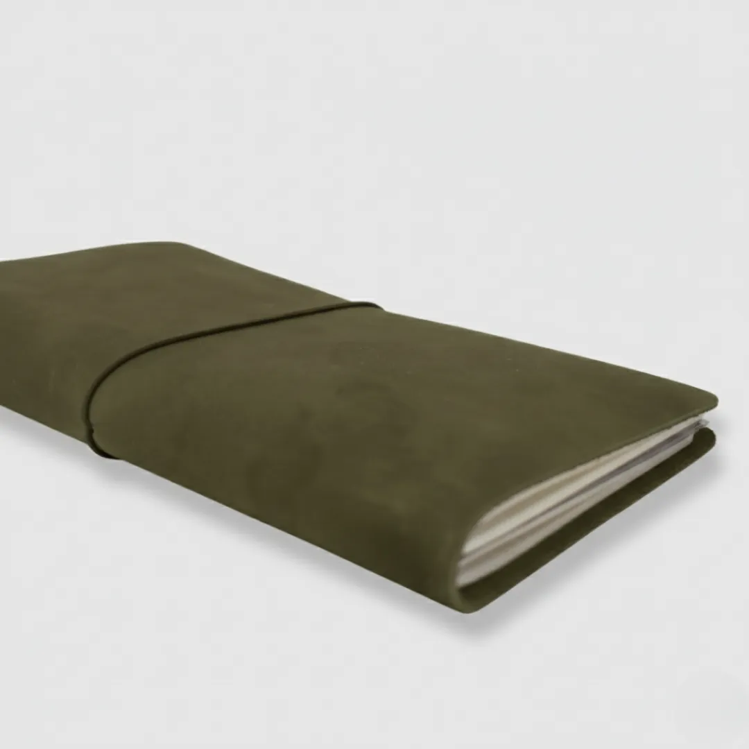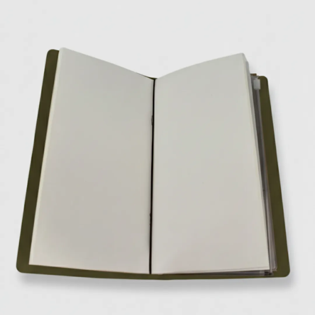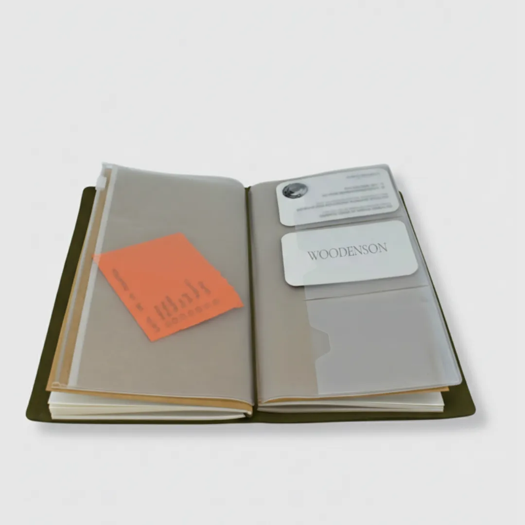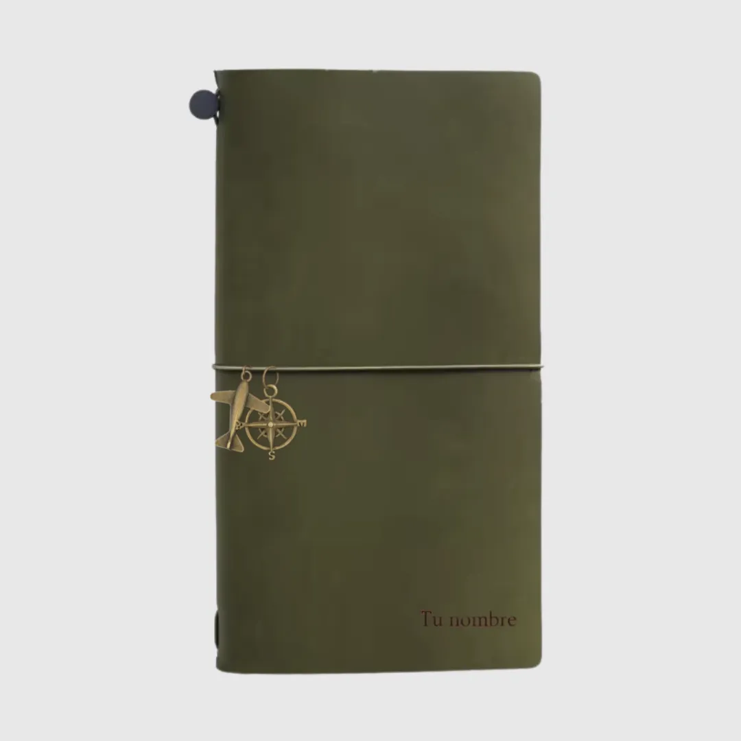 Traveller Notebook modular y recargable, diseñado para uso prolongado: tapas de cuero genuino que patinan con el tiempo, recambios intercambiables que se adaptan a distintas necesidades, funda de PVC con cremallera y tarjetero integrado. El amuleto aleatorio y la opción de grabar iniciales lo convierten en una pieza exclusiva.